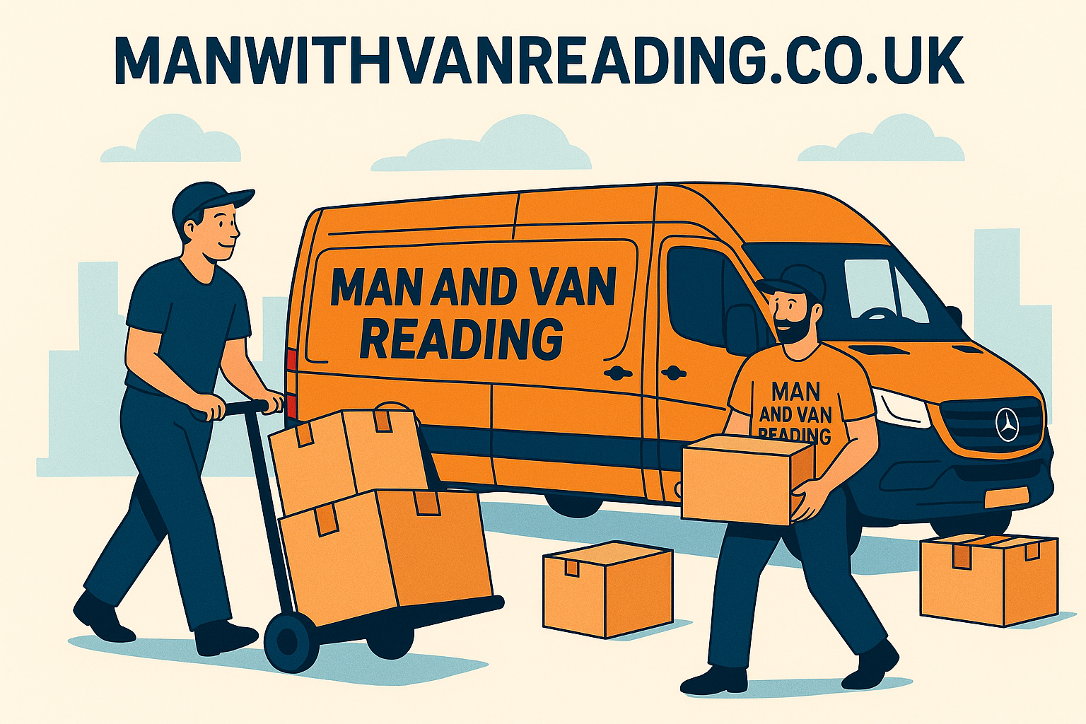 Illustration of Man and Van Reading movers loading boxes into an orange branded van